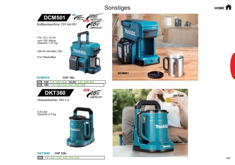121DKT360DKT360ZDCM501DCM501ZDCM501Ah Ah 1.5 / 2.0 / 3.0 / 4.0 / 5.0 / 6.0 Ah Ah 12V 1.5 / 2.0 / 4.0 14.4V 1.5 / 3.0 / 6.0Ah Ah 18V 1.5 / 2.0 / 3.0 / 4.0 / 5.0 / 6.0 DKT360Sonstiges HOME0.8 LiterGewicht 2.0 kgWasserkocher 18V x 2300 W mit Akku 18VF%u00fcr FilterkaffeeF%u00fcr 12V, 14.4V und 18V AkkusGewicht 1.47 kgKaffeemaschine 12V bis18VCHF 239.-CHF 159.-
