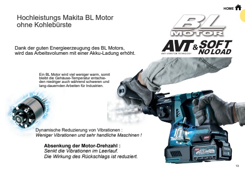 13HOMEAbsenkung der Motor-Drehzahl :Senkt die Vibrationen im Leerlauf.Die Wirkung des R%u00fcckschlags ist reduziert.Dank der guten Energieerzeugung des BL Motors, wird das Arbeitsvolumen mit einer Akku-Ladung erh%u00f6ht.Hochleistungs Makita BL Motor ohne Kohleb%u00fcrsteEin BL Motor wird viel weniger warm, somit bleibt die Geh%u00e4use-Temperatur entschieden niedriger auch w%u00e4hrend schweren und lang-dauernden Arbeiten f%u00fcr Industrien.Dynamische Reduzierung von Vibrationen : Weniger Vibrationen und sehr handliche Maschinen !