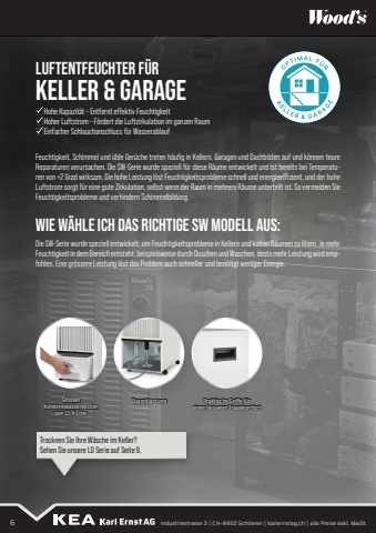 LUFTENTFEUCHTER F%u00dcRKELLER & GARAGEFeuchtigkeit, Schimmel und %u00fcble Ger%u00fcche treten h%u00e4ufig in Kellern, Garagen und Dachb%u00f6den auf und k%u00f6nnen teure Reparaturen verursachen. Die SW-Serie wurde speziell f%u00fcr diese R%u00e4ume entwickelt und ist bereits bei Temperaturen von +2 Grad wirksam. Die hohe Leistung l%u00f6st Feuchtigkeitsprobleme schnell und energieeffizient, und der hohe Luftstrom sorgt f%u00fcr eine gute Zirkulation, selbst wenn der Raum in mehrere R%u00e4ume unterteilt ist. So vermeiden Sie Feuchtigkeitsprobleme und verhindern Schimmelbildung.Hohe Kapazit%u00e4t %u2013 Entfernt effektiv Feuchtigkeit Hoher Luftstrom %u2013 F%u00f6rdert die Luftzirkulation im ganzen Raum Einfacher Schlauchanschluss f%u00fcr WasserablaufWIE W%u00c4HLE ICH DAS RICHTIGE SW MODELL AUS:Die SW-Serie wurde speziell entwickelt, um Feuchtigkeitsprobleme in Kellern und kalten R%u00e4umen zu l%u00f6sen. Je mehr Feuchtigkeit in dem Bereich entsteht, beispielsweise durch Duschen und Waschen, desto mehr Leistung wird empfohlen. Eine gr%u00f6ssere Leistung l%u00f6st das Problem auch schneller und ben%u00f6tigt weniger Energie.Trocknen Sie Ihre W%u00e4sche im Keller?Sehen Sie unsere LD Serie auf Seite 9.GrossesKondenswasserbeckenvon 11.4 LiterZugentlastung Praktische Griffe f%u00fcreinen besseren Tragekomfort6 Industriestrasse 3 | CH-8952 Schlieren | karlernstag.ch | alle Preise exkl. MwSt.