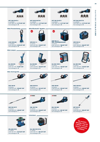 GRL 650 CHVGin L-BOXX0%u2005601%u2005061%u2005V01 / 2%u2009415.00* CHFServicekategorie: DGPT 18V-32 KIT SVin XL-BOXX0%u2005601%u20059M2%u2005102 / 2%u2009177.00* CHFServicekategorie: DGPT 18V-32 KIT Uin XL-BOXX0%u2005601%u20059M2%u2005103 / 2%u2009177.00* CHFServicekategorie: DGLL 18V-120-33 CGin L-BOXX0%u2005601%u2005065%u2005101 / 881.00* CHFServicekategorie: DGLI 18V-300im Karton 0%u2005601%u20054A1%u2005100 / 73.00* CHF Servicekategorie: A0%u2005601%u20059P0%u2005000in XL-BOXX0%u2005601%u20059P0%u2005000 / 2%u2009722.00* CHFServicekategorie: DGHE 18V-50im Karton 0%u2005600%u20058C9%u2005500 / 228.00* CHF Servicekategorie: BGKE 18V-25 TPim Karton 0%u2005600%u20058D6%u2005000 / 429.00* CHF Servicekategorie: %u2013GBL 18V-750im Karton 0%u2005600%u20058D2%u2005000 / 224.00* CHF Servicekategorie: CGBL 18V-800im Karton 0%u2005600%u20058D2%u2005200 / 257.00* CHF Servicekategorie: CGLI 18V-800im Karton 0%u2005601%u2005443%u2005600 / 104.00* CHF Servicekategorie: AGRT 18V-33 im Karton 0%u2005600%u20058D0%u2005000 / 300.00* CHF Servicekategorie: %u2013GPB 18V-1 C INKL. AKKUABDECKUNGim Karton 0%u2005601%u20054A7%u2005001 / 130.00* CHF Servicekategorie: BGHE 18V-50 IIim Karton 0%u2005600%u20058C9%u2005600 / 241.00* CHF Servicekategorie: BGHE 18V-60im Karton 0%u2005600%u20058C9%u2005000 / 235.00* CHF Servicekategorie: BGLI 18V-1200 Cim Karton 0%u2005601%u2005446%u2005700 / 128.00* CHF Servicekategorie: AGPB 18V-1 Cim Karton 0%u2005601%u20054A7%u2005000 / 118.00* CHF Servicekategorie: BGHE 18V-60 IIim Karton 0%u2005600%u20058C9%u2005400 / 249.00* CHF Servicekategorie: BGLI 18V-1900im Karton 0%u2005601%u2005446%u2005400 / 147.00* CHF Servicekategorie: AGPB 18V-6 Cim Karton 0%u2005601%u20054A6%u2005000 / 324.00* CHF Servicekategorie: BGPT 18V-32 KIT Uin XL-BOXX0%u2005601%u20059M2%u2005103 / 2%u2009177.00* CHFServicekategorie: DGPT 18V-32 KIT THin XL-BOXX0%u2005601%u20059M2%u2005104 / 2%u2009177.00* CHFServicekategorie: DAkku-PresswerkzeugAkku-LampenAkku-Gartenger%u00e4teLinienlaserAkku-Bluetooth%u00ae SpeakerDie meistenModelle sind alsL-BOXX- und als Karton-Varianteerh%u00e4ltlichNEU! NEU!23Bosch PRO NEWS | 01.09. bis 31.12.2025
