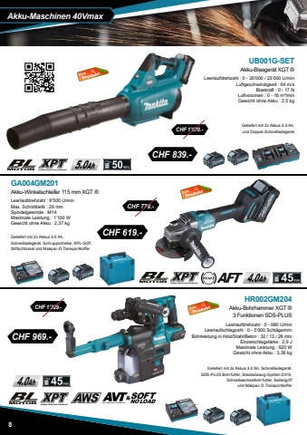 CHF 1%u2019070.-CHF 839.- CHF 779.- CHF 619.- CHF 969.-CHF 1%u2019229.- Akku-Maschinen 40VmaxUB001G-SETAkku-Blasger%u00e4t XGT %u00ae Leerlaufdrehzahl : 0 - 20%u2019000 / 23%u2019000 U/minLuftgeschwindigkeit : 64 m/s Blaskraft : 0 - 17 NLuftvolumen : 0 - 16 m%u00b3/minGewicht ohne Akku : 2,5 kgGeliefert mit 2x Akkus 5.0 Ah, und Doppel-Schnellladeger%u00e4tGA004GM201Akku-Winkelschleifer 115 mm XGT %u00ae Leerlaufdrehzahl : 8%u2019500 U/minMax. Schnitttiefe : 29 mmSpindelgewinde : M14Maximale Leistung : 1%u2019100 WGewicht ohne Akku : 2,37 kgGeliefert mit 2x Akkus 4.0 Ah, Schnellladeger%u00e4t, Schruppscheibe, KPL-Griff, Stiftschl%u00fcssel und Makpac-D TransportkofferHR002GM204Akku-Bohrhammer XGT %u00ae 3 Funktionen SDS-PLUSLeerlaufdrehzahl : 0 - 980 U/minLeerlaufschlagzahl : 0 - 5%u2019000 Schl%u00e4ge/minBohrleistung in Holz/Stahl/Beton : 32 / 13 / 28 mm Einzelschlagst%u00e4rke : 2,9 JMaximale Leistung : 620 WGewicht ohne Akku : 3,36 kgGeliefert mit 2x Akkus 4.0 Ah, Schnellladeger%u00e4t, SDS-PLUS Bohrfutter, Staubabsaug-System DX14, Schnellwechselbohrfutter, Seitengriff und Makpac-D Transportkoffer9911JBandschleifer 230 VLeistungsaufnahme : 650 WBandgeschwindigkeit : 75 - 270 m/minAbmessungen Schleifband : 76 x 457 mmL%u00e4nge des Netzkabels : 2,5 mGewicht : 2,7 kgGeliefert mit Staubsack und Makpac-C Transportkoffer8
