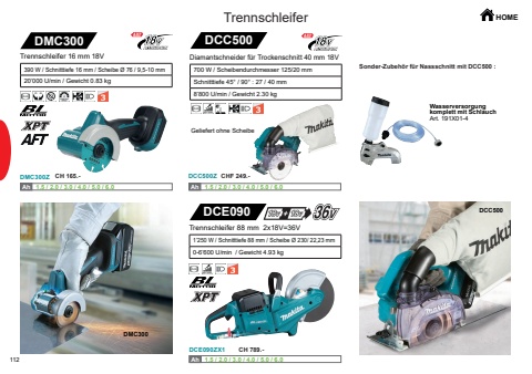 112DMC300DMC300ZDCC500Ah Ah 1.5 / 2.0 / 3.0 / 4.0 / 5.0 / 6.0 DCE090DCE090ZX1DMC300Ah Ah 1.5 / 2.0 / 3.0 / 4.0 / 5.0 / 6.0 DCC500DCC500ZAh Ah 1.5 / 2.0 / 3.0 / 4.0 / 5.0 / 6.0 HOME390 W / Schnitttiefe 16 mm / Scheibe %u00d8 76 / 9,5-10 mm20%u2019000 U/min / Gewicht 0.83 kgTrennschleifer 16 mm 18V TrennschleiferTrennschleifer 88 mm 2x18V=36V 1%u2019250 W / Schnitttiefe 88 mm / Scheibe %u00d8 230/ 22,23 mm0-6%u2019600 U/min / Gewicht 4.93 kg 700 W / Scheibendurchmesser 125/20 mmSchnitttiefe 45%u00b0 / 90%u00b0 : 27 / 40 mm8%u2019800 U/min / Gewicht 2.30 kg Diamantschneider f%u00fcr Trockenschnitt 40 mm 18VSonder-Zubeh%u00f6r f%u00fcr Nassschnitt mit DCC500 :Wasserversorgung komplett mit SchlauchArt. 191X01-4Geliefert ohne ScheibeCH 165.-CH 789.-CHF 249.-