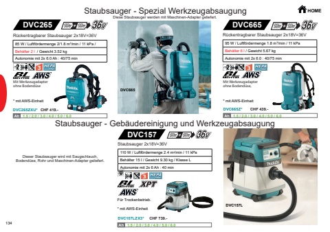 134DVC157LDVC157DVC157LZX3*Ah Ah 1.5 / 2.0 / 3.0 / 4.0 / 5.0 / 6.0 DVC265DVC265ZXU*DVC665DVC665Z*DVC665Ah Ah 1.5 / 2.0 / 3.0 / 4.0 / 5.0 / 6.0 Ah Ah 1.5 / 2.0 / 3.0 / 4.0 / 5.0 / 6.0 HOMEStaubsauger - Geb%u00e4udereinigung und WerkzeugabsaugungStaubsauger 2x18V=36V110 W / Luftf%u00f6rdermenge 2.4 m3/min / 11 kPaBeh%u00e4lter 15 l / Gewicht 9.30 kg / Klasse L Autonomie mit 2x 6 Ah : 40 minF%u00fcr Trockenbetrieb.* mit AWS-Einheit Dieser Staubsauger wird mit Saugschlauch, Bodend%u00fcse, Rohr und Maschinen-Adapter geliefert.* mit AWS-Einheit R%u00fcckentragbarer Staubsauger 2x18V=36V85 W / Luftf%u00f6rdermenge 2/1.8 m3/min / 11 kPa / Beh%u00e4lter 2 l / Gewicht 3.52 kgAutonomie mit 2x 6.0 Ah : 40/75 minR%u00fcckentragbarer Staubsauger 2x18V=36V95 W / Luftf%u00f6rdermenge 1.8 m3/min / 11 kPa Beh%u00e4lter 6 l / Gewicht 5.67 kgAutonomie mit 2x 6.0 : 40/75 min Mit Werkzeugadapterohne Bodend%u00fcseMit Werkzeugadapterohne Bodend%u00fcse, * mit AWS-Einheit Staubsauger - Spezial Werkzeugabsaugung Diese Staubsauger werden mit Maschinen-Adapter geliefert.CHF 739.-CHF 419.- CHF 439.-