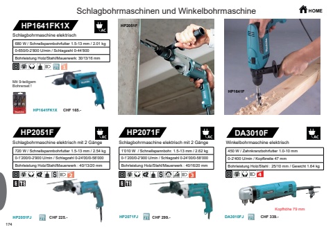 174HP1641FK1XHP1641FK1XHP2051FHP2051FJHP2071FHP2071FJHP1641FHP2051FDA3010FJDA3010FCHF 165.-CHF 225.- CHF 299.- CHF 339.-HOME680 W / Schnellspannbohrfutter 1.5-13 mm / 2.01 kg0-650/0-2%u2019800 U/min / Schlagzahl 0-44%u2019800Bohrleistung Holz/Stahl/Mauerwerk: 30/13/16 mmMit 9-teiligem Bohrerset !Schlagbohrmaschine elektrisch720 W / Schnellspannbohrfutter 1.5-13 mm / 2.54 kg 0-1%u2019200/0-2%u2019900 U/min / Schlagzahl 0-24%u201900/0-58%u2019000 Bohrleistung Holz/Stahl/Mauerwerk : 40/13/20 mm Schlagbohrmaschine elektrisch mit 2 G%u00e4nge1%u2019010 W / Schnellspannbohr. 1.5-13 mm / 2.62 kg0-1%u2019200/0-2%u2019900 U/min / Schlagzahl 0-24%u201900/0-58%u2019000Bohrleistung Holz/Stahl/Mauerwerk : 40/16/20 mm Schlagbohrmaschine elektrisch mit 2 G%u00e4ngeSchlagbohrmaschinen und WinkelbohrmaschineKopfh%u00f6he 79 mmWinkelbohrmaschine elektrisch450 W / Zahnkranzbohrfutter 1.0-10 mm 0-2%u2019400 U/min / Kopfbreite 47 mmBohrleistung Holz/Stahl : 25/10 mm / Gewicht 1.64 kgSchlagschrauber