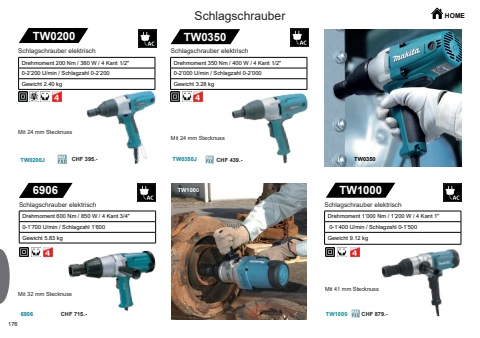 176TW0200TW0200JTW03506906TW0350J6906 TW1000TW1000TW0350TW1000CHF 439.-CHF 715.- CHF 879.-CHF 395.-HOMEMit 24 mm StecknussMit 24 mm StecknussDrehmoment 350 Nm / 400 W / 4 Kant 1/2\0-2%u2019000 U/min / Schlagzahl 0-2%u2019000 Gewicht 3.28 kgSchlagschrauber elektrischDrehmoment 600 Nm / 850 W / 4 Kant 3/4\0-1%u2019700 U/min / Schlagzahl 1%u2019600Gewicht 5.83 kgSchlagschrauber elektrischMit 32 mm StecknussMit 41 mm StecknussDrehmoment 1%u2019000 Nm / 1%u2019200 W / 4 Kant 1\ 0-1%u2019400 U/min / Schlagzahl 0-1%u2019500Gewicht 9.12 kgSchlagschrauber elektrischDrehmoment 200 Nm / 380 W / 4 Kant 1/2\0-2%u2019200 U/min / Schlagzahl 0-2%u2019200 Gewicht 2.40 kgSchlagschrauber elektrischSchlagschrauber