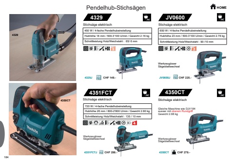 18443294329JJV0600JV0600J4350CT4350CT4351FCT4351FCTJ4350CT4329CHF 149.- CHF 225.-CHF 299.- CHF 279.-HOMEStichs%u00e4ge elektrisch450 W / 4-fache PendelhubeinstellungHubh%u00f6he 18 mm / 500-3%u2019100 U/min / Gewicht 2.16 kgSchnittleistung Holz/Weichstahl : 65/ 6 mm650 W / 4-fache PendelhubeinstellungHubh%u00f6he 23 mm / 500-3%u2019100 U/min / Gewicht 2.78 kgSchnittleistung Holz/Weichstahl : 90 /10 mmStichs%u00e4ge elektrischWerkzeugloserS%u00e4geblattwechselStichs%u00e4ge elektrisch720 W / 4-fache PendelhubeinstellungHubh%u00f6he 26 mm / 800-2%u2019800 U/min / Gewicht 2.80 kgSchnittleistung Holz/Weichstahl : 135 / 10 mmStichs%u00e4ge elektrischPendelhub-Stichs%u00e4genWerkzeugloser S%u00e4geblattwechselWerkzeugloserS%u00e4geblattwechselGleiche Maschine wie DJV184ausser mit oberem RundgriffGewicht 2.88 kgHolzs%u00e4gen