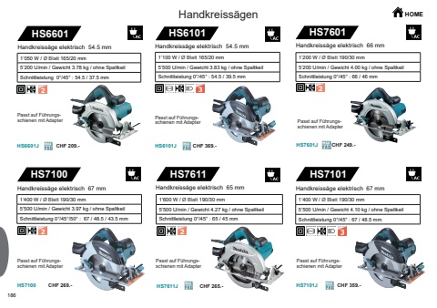 186HS6601HS6601JHS6101 HS7601HS6101J HS7601JHS7100 HS7611 HS7101HS7100 HS7611J HS7101JCHF 209.- CHF 369.- CHF 249.-CHF 269.- CHF 265.- CHF 359.-HOMEHandkreiss%u00e4ge elektrisch 54.5 mm1%u2019050 W / %u00d8 Blatt 165/20 mm5%u2019200 U/min / Gewicht 3.78 kg / ohne SpaltkeilSchnittleistung 0%u00b0/45%u00b0 : 54.5 / 37.5 mmHandkreiss%u00e4ge elektrisch 54.5 mm1%u2019100 W / %u00d8 Blatt 165/20 mm5%u2019500 U/min / Gewicht 3.83 kg / ohne SpaltkeilSchnittleistung 0%u00b0/45%u00b0 : 54.5 / 39.5 mmHandkreiss%u00e4ge elektrisch 66 mm1%u2019200 W / %u00d8 Blatt 190/30 mm5%u2019200 U/min / Gewicht 4.00 kg / ohne SpaltkeilSchnittleistung 0%u00b0/45%u00b0 : 66 / 46 mmPasst auf F%u00fchrungsschienen mit AdapterHandkreiss%u00e4genPasst auf F%u00fchrungsschienen mit AdapterPasst auf F%u00fchrungsschienen mit AdapterHandkreiss%u00e4ge elektrisch 65 mm1%u2019600 W / %u00d8 Blatt 190/30 mm5%u2019500 U/min / Gewicht 4.27 kg / ohne SpaltkeilSchnittleistung 0%u00b0/45%u00b0 : 65 / 45 mm1%u2019400 W / %u00d8 Blatt 190/30 mm5%u2019500 U/min / Gewicht 3.97 kg / ohne SpaltkeilSchnittleistung 0%u00b0/45%u00b0/50%u00b0 : 67 / 48.5 / 43.5 mmHandkreiss%u00e4ge elektrisch 67 mm Handkreiss%u00e4ge elektrisch 67 mm1%u2019400 W / %u00d8 Blatt 190/30 mm5%u2019500 U/min / Gewicht 4.10 kg / ohne SpaltkeilSchnittleistung 0%u00b0/45%u00b0 : 67 / 48.5 mmPasst auf F%u00fchrungsschienen mit AdapterPasst auf F%u00fchrungsschienen mit AdapterPasst auf F%u00fchrungsschienen mit Adapter