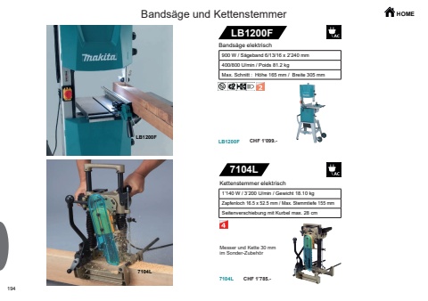 1947104L7104L7104LLB1200FLB1200FLB1200FCHF 1%u2019785.-CHF 1%u2019099.-HOMEKettenstemmer elektrisch 1%u2019140 W / 3%u2019200 U/min / Gewicht 18.10 kgZapfenloch 16.5 x 52.5 mm / Max. Stemmtiefe 155 mmSeitenverschiebung mit Kurbel max. 28 cmMesser und Kette 30 mm im Sonder-Zubeh%u00f6r900 W / S%u00e4geband 6/13/16 x 2%u2019240 mm400/800 U/min / Poids 81.2 kgMax. Schnitt : H%u00f6he 165 mm / Breite 305 mmBands%u00e4ge elektrischBands%u00e4ge und Kettenstemmer