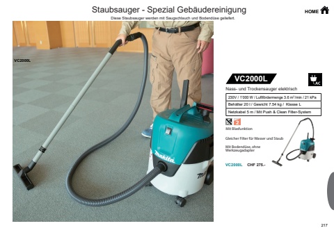 217VC2000LVC2000LVC2000LCHF 275.-HOMEMit BlasfunktionGleicher Filter f%u00fcr Wasser und StaubMit Bodend%u00fcse, ohne WerkzeugadapterNass- und Trockensauger elektrisch230V / 1%u2019000 W / Luftf%u00f6rdermenge 3.6 m3 /min / 21 kPa Beh%u00e4lter 20 l / Gewicht 7.54 kg / Klasse LNetzkabel 5 m / Mit Push & Clean Filter-SystemStaubsauger - Spezial Geb%u00e4udereinigungDiese Staubsauger werden mit Saugschlauch und Bodend%u00fcse geliefert.Staubsauger