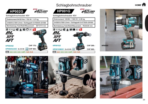 HOME23HP001GZHP001GM201 2x 4.0 AhHP001GHP002GZHP002GA202 2x 2.0 AhHP002GAh Ah 2.0 / 2.5 / 4.0 / 4.0F / 5.0 / 8.0 Ah Ah 2.0 / 2.5 / 4.0 / 4.0F / 5.0 / 8.0 HP002GHP002GHP001GDrehmoment 140/68 / 1%u2019000 W / 2.06 kg0-650/0-2%u2019600 U/min / Schlagzahl 0-9%u2019750/0-39%u2019000Bohrleistung Holz/Stahl/Mauerwerk : 76/20/20 mmSchlagbohrschrauber 40VDrehmoment 64/30 Nm / 750 W / 1.27 kg0-600/0-2%u2019200 U/min / Schlagzahl 0-9%u2019000/0-33%u2019000Bohrleistung Holz/Stahl/Mauerwerk : 38/13/13 mm Schlagbohrschrauber 40VSchlagbohrschrauberSchlagbohr- und SchlagschrauberCHF 289.-CHF 885.-CHF 179.-CHF 589.-