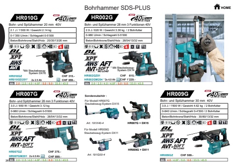 HOME26HR002GHR002GZ01HR002GM204 * 2x 4.0 AhHR007GHR007GM201HR009GHR007GZHR009GZHR010GZHR010GD201* 2x 2.5 AhHR010GHR010G + DX162x 4.0 AhArt. 191X40-4 HR007G + DX15Art. 191G00-4HR009G + DX11Ah Ah 2.0 / 2.5 / 4.0 / 4.0F / 5.0 / 8.0 / 33.5 / 43.5 Ah Ah 2.0 / 2.5 / 4.0 / 4.0F / 5.0 / 8.0 / 33.5 / 43.5Ah Ah 2.0 / 2.5 / 4.0 / 4.0F / 5.0 / 8.0 / 33.5 / 43.5 Ah Ah 4.0 / 4.0F / 5.0 / 8.0 / 33.5 / 43.5Bohr- und Spitzhammer 28 mm 3 Funktionen 40V2.9 J / 620 W / Gewicht 3.36 kg / 2 Bohrfutter0-980 U/min / Schlagzahl 0-5%u2019000Beton/Bohrkrone/Stahl/Holz : 28/54/13/32 mm* Mit StaubabsaugSystem DX14Bohrhammer SDS-PLUSBohr- und Spitzhammer 28 mm 3 Funktionen 40V3.0 J / 850 W / Gewicht 3.12 kg0-980 U/min / Schlagzahl 0-5%u2019000Beton/Bohrkrone/Stahl/Holz : 28/54/13/32 mm3.9 J / 1%u2019600 W / Gewicht 4.62 kg / 2 Bohrfutter0-840 U/min / Schlagzahl 0-4%u2019500 / 2 BohrfutterBeton/Bohrkrone/Stahl/Holz : 30/80/13/32 mmBohr- und Spitzhammer 30 mm 40V2.1 J / 1%u2019000 W / Gewicht 2.14 kg 0-1%u2019350 U/min / Schlagzahl 0-5%u2019000Beton/Bohrkrone/Stahl/Holz : 20/35/13/26 mmBohr- und Spitzhammer 20 mm 40V*Mit StaubabsaugSystem DX16 F%u00fcr Modell HR007GStaubabsaug-System DX15F%u00fcr Modell HR009GStaubabsaug-System DX11Sonderzubeh%u00f6r :H%u00e4mmerCHF 615.-CHF 1%u2019229.-CHF 375.-CHF 899.- CHF 589.-CHF 315.-CHF 859.-