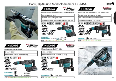 HOME27HR005GHR005GZ01HR005GM202 2x 4.0 AhHR005GAh Ah 4.0 / 4.0F / 5.0 / 8.0 / 33.5 / 43.5HM001GHM001GM201HM001GZ022x 4.0 AhAh Ah 2.5 / 4.0 / 4.0F / 5.0 / 8.0 / 33.5 / 43.5HM002GHM002GZ03Ah Ah 4.0 / 4.0F / 5.0 / 8.0HR006GZHR006GAh Ah 4.0 / 4.0F / 5.0 / 8.0 / 33.5 / 43.5HM002GBohr- und Spitzhammer 40 mm 2 Funktionen 40V8.0 J / Gewicht 6.70 kg0-2%u2019900 U/min / Schlagzahl 0-500Bohrleistung Beton / mit Bohrkrone: 40 mm /105 mmBohr-, Spitz- und Meisselhammer SDS-MAXMeisselhammer 40Vmax9.4 J / 1%u2019100 W Schlagzahl 0-2%u2019650 / Gewicht 5.63 kg Meisselhammer 2x40V = 80V 20.9 J / 2%u2019600 W Schlagzahl 950-1%u2019900 / Gewicht 10.70 kg Bohr- und Spitzhammer 52 mm 2x40V=80V21.4 J / 2%u2019600 W / Gewicht 11.55 kg150-310 U/min / Schlagzahl 1%u2019100-2%u2019250Bohrleistung in Beton : 52/160 mmCHF 945.-CHF 1%u2019469.-CHF 1%u2019085.-CHF 559.-CHF 869.-CHF 1%u2019209.-