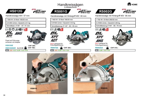 HOME30RS002GRS002GZRS001GRS001GZHS012GZHS012GD201HS012G2x 2.5 AhAh Ah 2.0 / 4.0 / 4.0F / 5.0 / 8.0 Ah Ah 4.0 / 4.0F / 5.0 / 8.0 Ah Ah 4.0F / 5.0 / 8.0 RS001G RS002GHandkreiss%u00e4gen Linksschnitt1%u2019700 W / %u00d8 Blatt 260/30 mm0-4%u2019000 U/min / Gewicht 5.09 kgSchnittleistung 0%u00b0/45%u00b0 : 95 / 70 mmHandkreiss%u00e4ge mit Hintergriff 40V 65 mm1%u2019400 W / %u00d8 Blatt 185/30 mm0-6%u2019400 U/min / Gewicht 4.42 kgSchnittleistung 0%u00b0/ 45%u00b0 : 65 / 45 mmHandkreiss%u00e4ge 40V 57 mm Handkreiss%u00e4ge mit Hintergriff 40V 95 mm1%u2019300 W / %u00d8 Blatt 165/20 mm0-5%u2019200 U/min / Gewicht 2.51 kgSchnittleist. 0%u00b0/45%u00b0 : 57 / 41 mmPasst auf F%u00fchrungsschienen mit Adapter Nicht geeignet f%u00fcr F%u00fchrungsschienen Nicht geeignet f%u00fcr F%u00fchrungsschienen CHF 355.- CHF 519.-CHF 365.-CHF 799.-