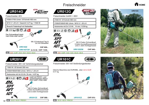HOME62UR014GUR014GT201UR014GZ2x 5.0 AhAh Ah 4.0 / 4.0F / 5.0 / 8.0 / 33.5 / 43.5UR012GUR012GZ06Ah Ah 4.0 / 4.0F / 5.0 / 8.0 / 33.5 / 43.5UR012GUR101CUR101CZUR201CUR201CZAh Ah 33.5 / 43.5 / PDC01 Ah Ah 33.5 / 43.5 / PDC01UR201CFreischneiderFreischneider 40V4%u2019000-5%u2019700 U/min / %u00d8 Schnitt 450 mmM10 X 1.25 LH / Gewicht 5.27 kg / 1%u2019500 WBraucht Fadenkopf mit KeilwellenDer Schneidkopf dreht nach links oder rechtsMit 2-Fadenkopf Tap & Go mit Keilwellen2%u2019000 W / %u00d8 Schnitt 480 mm3%u2019500/5%u2019000/6%u2019400 U/min / M10 X 1.25 LH Autonomie mit 2x 5.0 Ah : 14 min / 6.59 kgFreischneider 2x40V = 80VMit 2-Faden Schneidkopf, 3-Zahn Kunstoffmesserkopf und 2- Zahn Schlagmesser1%u2019000 W / %u00d8 Schnitt 350 mm4%u2019000/4%u2019600/5%u2019000 U/min / M10 x 1.25 LH Autonomie mit 4x 6.0 Ah 18 min / 4.87 kg Freischneider 36V mit VerbindungssteckerMit 2-Faden Schneidkopf, 3-Zahn Kunstoffmesserkopf und 2-Zahn SchlagmesserFreischneider 36V mit VerbindungssteckerL%u00e4uft mit PDC01, und r%u00fcckentragbaren Akkus PDC1200 + PDC1500Gleiche Maschine wie DUR368L, aber mit U-Griff5.41 kgCHF 1%u2019235.-CHF 609.-CHF 949.-CHF 569.- CHF 619.-