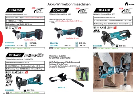 80DDA350ZJDDA350RTJ 2x 5.0 AhDDA350DDA351ZJDDA351RTJ 2x 5.0 AhDDA351Ah Ah 1.5 / 2.0 / 3.0 / 4.0 / 5.0 / 6.0 Ah Ah 1.5 / 2.0 / 3.0 / 4.0 / 5.0 / 6.0 DDA450ZKDDA450Ah Ah 1.5 / 2.0 / 3.0 / 4.0 / 5.0 / 6.0 DDA450DDA460DDA460ZK191P11-3Ah Ah 1.5 / 2.0 / 3.0 / 4.0 / 5.0 / 6.0 / 33.5 / 43.5DDA460HOMEWinkelbohrmaschine 18VDrehmoment 14 Nm / 280 W / Zahnkranzbohrfutter 1.5-10 mm0-1%u2019800 U/min / 1.15 kgBohrleistung Holz/ Stahl : 25/10 mmKopfh%u00f6he 66 mmKopfh%u00f6he 88 mmAkku-WinkelbohrmaschinenWinkelbohrmaschine 18VGleiche Maschine wie DDA350ausser mit Schnellspannbohrfutter 0.8-10 mm1.18 kgWinkelbohrmaschine 18VDrehmoment 70 Nm / 650 W 0-450/1%u2019400 U/min / Zahnkranzbohrfutter 1.5-13 mmBohrleistung Holz: 65/127 / Stahl: 13 mm / 3.06 kgDrehmoment 136 Nm / 1%u2019350 W0-350/1%u2019400 U/min / Zahnkranzbohrfutter 1.5-13 mmBohrleistung Holz: 65/159 / Stahl: 13 mm / 5.11 kgWinkelbohrmaschine 2x18V=36VOptionales Zubeh%u00f6r f%u00fcr DDA460 und DA001GGriff-Set Vordergriff in D-Form und Seitengriff in L-FormVerwandelt die Winkelbohrer DDA460 und DA001G in Erdbohrer.CHF 269.-CHF 539.- CHF 539.-CHF 269.-CHF 415.-CHF 715.-