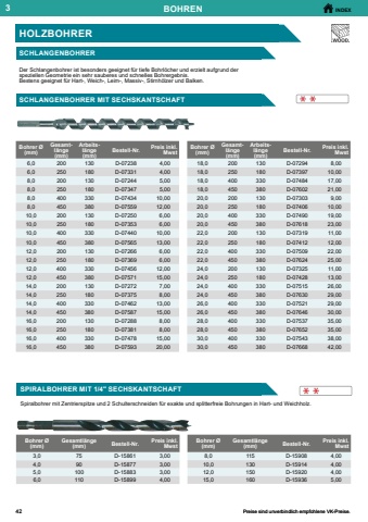 226INDEXPreise sind unverbindlich empfohlene VK-Preise.SCHRAUBENARMIERUNGSEISEN-BINDEHAKENL%u00e4nge (mm)Stk/PkgBestell-Nr.Preis inkl. Mwst1201194731-241,00TIEFENANSCHLAG F%u00dcR SCHRAUBERBeschreibungGeeignet f%u00fcr ModelleBestell-Nr.Preis inkl. MwstTiefenanschlag kurz zu brauchen mit 60 mm Bithalter P-05979FS2300 / FS4300 / FS6300DFS451 / DFS452 / DFS250 DFS251197025-414,00Bithalter magnetisch mit Sicherheitsring60 cm / 1/4\P-0597915,00Bit PH2 standard784211-24,00Beim Eindrehen von der Gewindestange in den Einsatzhalter, bewegen sich die Stifte in dem Halter gegen das Zentrum entlang der Stange und halten sie fest. In dieser Situation ist es einfach die Gewindestange mit Hilfe der H%u00fclse zu schrauben.Gr%u00f6sseStk/PkgBestell-Nr.Preis inkl. MwstM61B-4296128,00M81B-4297729,00M101B-4298330,00VERSCHIEDENES ZUBEH%u00d6REINSATZHALTER F%u00dcR GEWINDESTANGEN