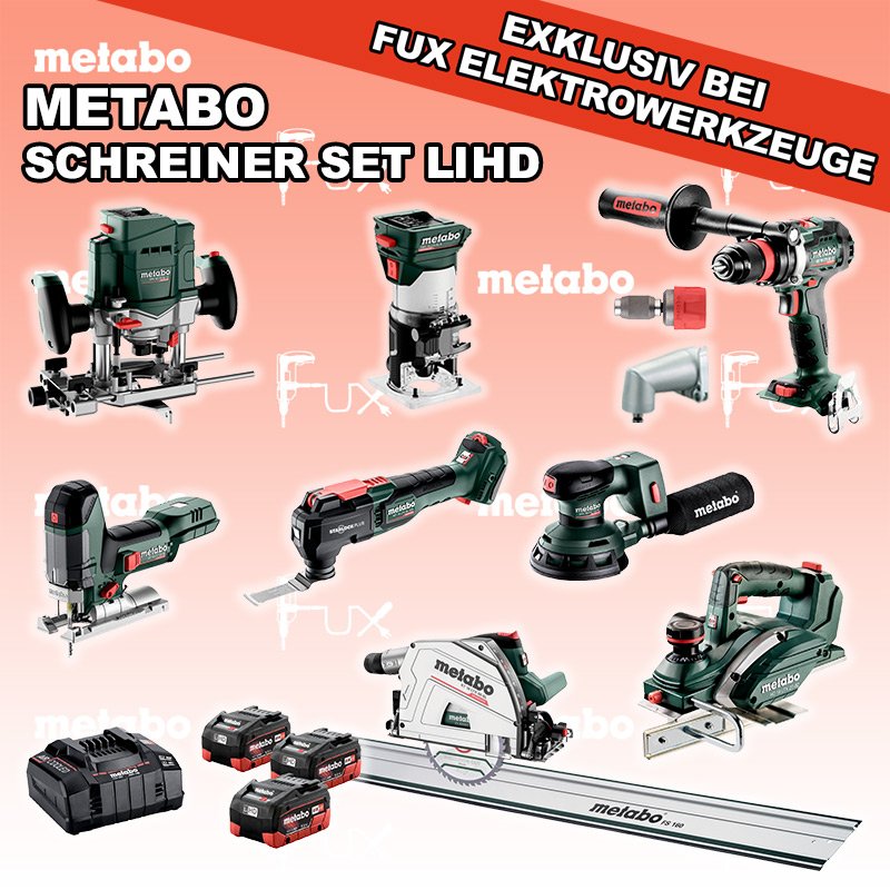 Heute auf dieses Produkt 40% Rabatt! Zu "Schreiner Set" von Metabo FULL Service: 36 Monate zum Nulltarif für Sie! Weitere Infos zum FULL Service Dieses Produkt ist CAS kompatibel! Weitere Infos zu CAS Black Fuxday Aktionen FUX SPECIAL EXKLUSIV BEI FUX Metabo Schreiner Set XXL 3 LiHD Bestell- und Artikelnummer: Schreiner Set XXL 3 LiHD ST 18 LT 130 BL Akku-StichsägeAkkuspannung 18 V Hubzahl 1000-3.500 /min Gewicht ohne Akkupack 1.5 kgInfos BS 18 LTX BL Q I Akku-BohrschrauberAkkuspannung 18 V Drehzahl 0-550 / 0-2000 U/min Drehmoment hart / weich 130 / 65 Nm Gewicht (mit Akkupack) 2.3 kgInfos FMV 18 LTX BL 8 Akku Kantenfräse Akkuspannung 18 V Leerlaufdrehzahl 4.800 - 29.000 /min Spannbohrung der Spannzange 6 / 8 mmInfos OFV 18 LTX BL 12 Akku-OberfräseAkkuspannung 18 V Leerlaufdrehzahl 11.000 - 25.000 / min Spannbohrung der Spannzange 6 / 8 / 12 mm Gewicht ohne Akkupack 2.900 gInfos KT 18 LTX 66 BL Akku TauchkreissägeAkkuspannung 18 V Schnitt-Tiefe bei 90° 0-66 mm Sägeblatt 165 mm Gewicht 5.3 kgInfos HO 18 LTX 20-82 Akku-Einhand-HobelAkkuspannung 18 V Hobelbreite 82 mm Spanabnahme einstellbar 0-2 mm Gewicht 3.5 KgInfos MT 18 LTX BL QSL Akku-Multitool Akkuspannung 18 V Schwingzahl bei Leerlauf 8.000 - 20.000 /min Schleifplatte, Maß Eck zu Eck 93 mm Gewicht 1.7 kgInfos SXA 18 LTX 125 BL Exzenterschleifer Akkuspannung 18 V Durchmesser des Stütztellers 125 mm Leerlaufdrehzahl 4000 - 10000 /min Gewicht (mit Akkupack) 1.7 kg Infos FS 160 FührungsschieneGesamtlänge 1600 mmInfos 3 x 18 V, 5.5 Ah, LiHD Akkupack18 V 5.5 Ah ( LiHD Akkus ) Infos ASC 145, 12 - 36 V "Air Cooled" LadegerätZum Aufladen aller Li-Power Schiebesitz-Akkupacks (12 V - 36 V). Ladestrom 8.0 AInfos Schnellwechselbithalter »Quick«Schnellwechselbithalter »Quick« Geeignet für alle Metabo "Quick" Maschinen Bits mit 1/4 "Außensechskantantrieb Infos Schnellwechselwinkeladapter »Quick«Metabo "Quick" Maschinen mit Spannzange Ø 43 mm Magnetischer Bithalter mit 1/4 "(6,35 mm) SechskantschaftInfos Ergattere dir einen zweiten Akku bei der Registration auf metabo.ch Alle Produkte dieser Aktion anzeigen Standard-Ausrüstung In diesem Set enthalten: ST 18 LT 130 BL Akku-Stichsäge BS 18 LTX BL Q I Akku-Bohrschrauber FMV 18 LTX BL 8 Akku Kantenfräse OFV 18 LTX BL 12 Akku-Oberfräse KT 18 LTX 66 BL Akku Tauchkreissäge HO 18 LTX 20-82 Akku-Einhand-Hobel MT 18 LTX BL QSL Akku-Multitool SXA 18 LTX 125 BL Exzenterschleifer FS 160 Führungsschiene 3 x 18 V, 5.5 Ah, LiHD Akkupack ASC 145, 12 - 36 V "Air Cooled" Ladegerät Schnellwechselbithalter »Quick« Schnellwechselwinkeladapter »Quick« Zubehör Verbrauchsmaterial Listenpreis CHF 3'598.50 Fuxpreis CHF 2'159.00 inkl. 8.1% MwSt, inkl vRG Versand CHF 40.00 Kein Grauimport! Produkt bestellen 1 Stück 2 Stück 3 Stück 4 Stück 5 Stück 6 Stück 7 Stück 8 Stück 9 Stück 10 Stück Alle Angaben ohne Gewähr und solange Vorrat reicht!Wiederverkäufer werden? Produkt als PDFVideo LiHD 1Video LiHD 2 AKTION 40%