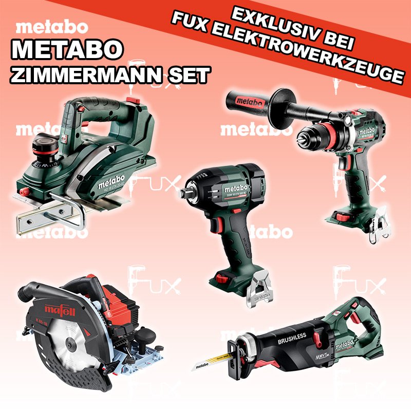 Heute auf dieses Produkt 14% Rabatt! Zu "Zimmermann Set" von Metabo FULL Service: 36 Monate zum Nulltarif für Sie! Weitere Infos zum FULL Service Dieses Produkt ist CAS kompatibel! Weitere Infos zu CAS Black Fuxday Aktionen FUX SPECIAL EXKLUSIV BEI FUX Metabo Zimmermann SET 7 SOLO Bestell- und Artikelnummer: Zimmermann SET 7 SOLO BS 18 LTX BL Q I Akku-BohrschrauberAkkuspannung 18 V Drehzahl 0-550 / 0-2000 U/min Drehmoment hart / weich 130 / 65 Nm Gewicht (mit Akkupack) 2.3 kgInfos SSW 18 LTX 550 BL Akku-SchlagschrauberAkkuspannung 18 V Anziehdrehmoment 550 Nm Werkzeugaufnahme 1/2" Gewicht ohne Akkupack 1,4 kgInfos SSEP 18 LTX BL MVT Akku-SäbelsägeAkkuspannung 18 V Hubzahl bei Leerlauf 0 - 3.000 /min Gewicht (mit Akkupack) 4.6 kgInfos HO 18 LTX 20-82 Akku-Einhand-HobelAkkuspannung 18 V Hobelbreite 82 mm Spanabnahme einstellbar 0-2 mm Gewicht 3.5 KgInfos K 85 - 18 PURE Akku-Handkreissägen im L-MAXSchnitttiefe 0 – 88 mm Schnitttiefe bei 45° 0 – 61.5 mm Gewicht (mit Akku) 8.1 kgInfos Ergattere dir einen Akku bei der Registration auf metabo.ch Alle Produkte dieser Aktion anzeigen OHNE AKKUS UND LADEGERÄT Standard-Ausrüstung In diesem Set enthalten: BS 18 LTX BL Q I Akku-Bohrschrauber SSW 18 LTX 550 BL Akku-Schlagschrauber SSEP 18 LTX BL MVT Akku-Säbelsäge HO 18 LTX 20-82 Akku-Einhand-Hobel K 85 - 18 PURE Akku-Handkreissägen im L-MAX Listenpreis CHF 2'582.20 Fuxpreis CHF 2'206.00 inkl. 8.1% MwSt, inkl vRG Versand CHF 25.00 Kein Grauimport! Produkt bestellen 1 Stück 2 Stück 3 Stück 4 Stück 5 Stück 6 Stück 7 Stück 8 Stück 9 Stück 10 Stück Alle Angaben ohne Gewähr und solange Vorrat reicht!Wiederverkäufer werden? Produkt als PDF NEUHEITAKTION 14%