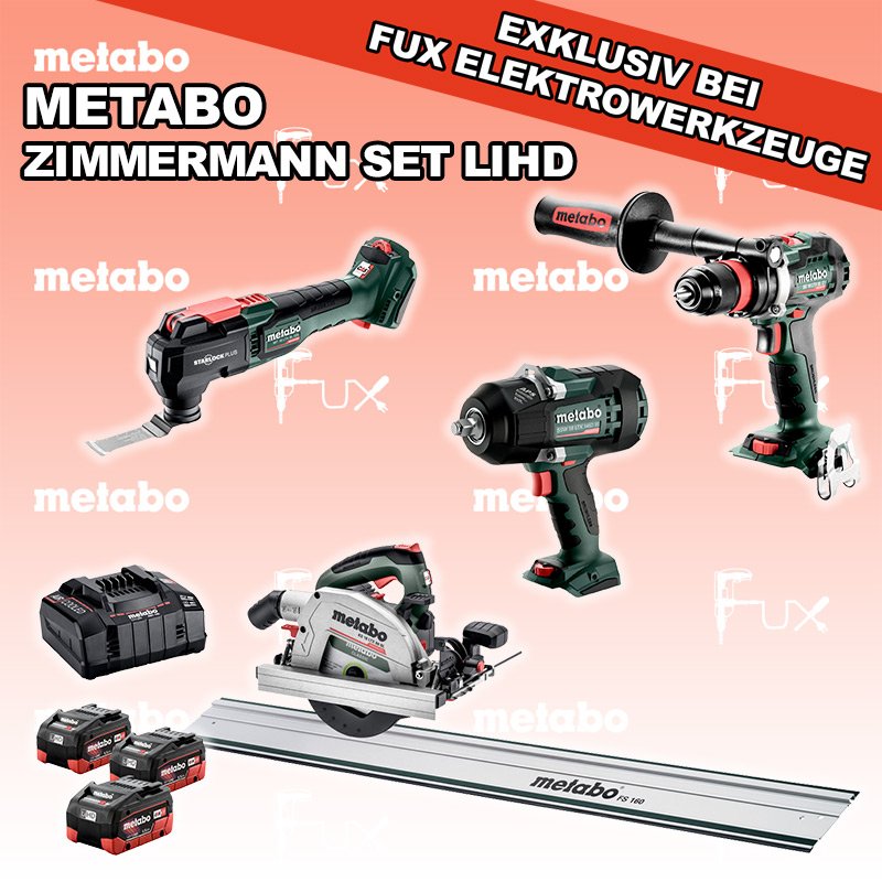 Heute auf dieses Produkt 27% Rabatt! Zu "Zimmermann Set" von Metabo FULL Service: 36 Monate zum Nulltarif für Sie! Weitere Infos zum FULL Service Dieses Produkt ist CAS kompatibel! Weitere Infos zu CAS Black Fuxday Aktionen FUX SPECIAL EXKLUSIV BEI FUX Metabo Zimmermann SET 18 LiHD Bestell- und Artikelnummer: Zimmermann SET 18 LiHD BS 18 LTX BL Q I Akku-BohrschrauberAkkuspannung 18 V Drehzahl 0-550 / 0-2000 U/min Drehmoment hart / weich 130 / 65 Nm Gewicht (mit Akkupack) 2.3 kgInfos MT 18 LTX BL QSL Akku-Multitool Akkuspannung 18 V Schwingzahl bei Leerlauf 8.000 - 20.000 /min Schleifplatte, Maß Eck zu Eck 93 mm Gewicht 1.7 kgInfos SSW 18 LTX 1450 BL Akku-SchlagschrauberAkkuspannung 18 V Anziehdrehmoment 1450 Nm Werkzeugaufnahme 1/2" Infos KS 18 LTX 66 BL Akku HandkreissägeAkkuspannung 18 V Schnitt-Tiefe bei 90° 0-66 mm Sägeblatt 165 mm Gewicht 4.5 kgInfos FS 160 FührungsschieneGesamtlänge 1600 mmInfos 3 x 18 V, 5.5 Ah, LiHD Akkupack18 V 5.5 Ah ( LiHD Akkus ) Infos ASC 145, 12 - 36 V "Air Cooled" LadegerätZum Aufladen aller Li-Power Schiebesitz-Akkupacks (12 V - 36 V). Ladestrom 8.0 AInfos Registriere die in diesem Set vorhandenen Metabo Maschinen auf metabo.ch, und ergattere dir bis zu 5 Gratis Akkus!Zusätzlich offerieren wir zu diesem Set einen Gratis Akku! Standard-Ausrüstung In diesem Set enthalten: BS 18 LTX BL Q I Akku-Bohrschrauber MT 18 LTX BL QSL Akku-Multitool SSW 18 LTX 1450 BL Akku-Schlagschrauber KS 18 LTX 66 BL Akku Handkreissäge FS 160 Führungsschiene 3 x 18 V, 5.5 Ah, LiHD Akkupack ASC 145, 12 - 36 V "Air Cooled" Ladegerät Listenpreis CHF 2'142.50 Fuxpreis CHF 1'549.00 inkl. 8.1% MwSt, inkl vRG Versand CHF 25.00 Kein Grauimport! Produkt bestellen 1 Stück 2 Stück 3 Stück 4 Stück 5 Stück 6 Stück 7 Stück 8 Stück 9 Stück 10 Stück Alle Angaben ohne Gewähr und solange Vorrat reicht!Wiederverkäufer werden? Produkt als PDF NEUHEITAKTION 27%
