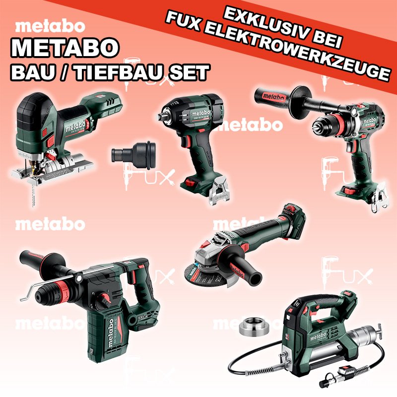 Metabo Bau / Tiefbau Set 2 SOLO BS 18 LTX BL Q I Akku-Bohrschrauber STA 18 LTX 150 BL Akku-Stichsäge KH 18 LTX BL 24 Q Akku-Kombihammer WVB 18 LT BL 11-125 Quick Akku-Winkelschleifer SSW 18 LTX 550 BL Akku-Schlagschrauber FP 18 LTX Akku Fettpresse Reduktions Adapter Adapter für Lube-Shuttle® 400G