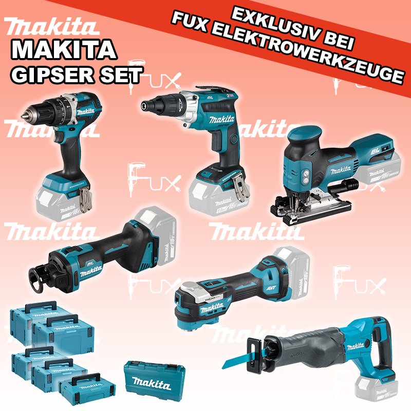 Makita  Gipser Set 9 SOLO DHP484ZJ Akku-Schlagbohrschrauber DFS251ZJ Akku-Schrauber DTM52Z Multifunktions Werkzeug DCO181Z Akku-Rotationsschneider DJR186ZK Akku-Säbelsäge DJV18ZJ Akku-Stichsäge MAKPAC Gr. 3 Einsatz für DTM52 MAKPAC Gr. 1 Einsatz für DCO181