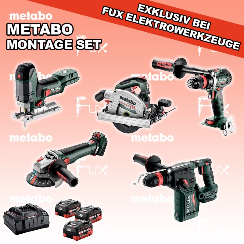 Zu "Montage Set" von Metabo FULL Service: 36 Monate zum Nulltarif für Sie! Weitere Infos zum FULL Service Dieses Produkt ist CAS kompatibel! Weitere Infos zu CAS FUX SPECIAL EXKLUSIV BEI FUX Metabo Montage Set 6 Bestell- und Artikelnummer: Montage Set 6 ST 18 LT 130 BL Akku-StichsägeAkkuspannung 18 V Hubzahl 1000-3.500 /min Gewicht ohne Akkupack 1.5 kgInfos KH 18 LTX BL 24 Q Akku-KombihammerAkkuspannung 18 V Einzelschlagstärke 2.2 J Bohrleistung in Beton 24 mm Gewicht ohne Akkupack 3 kgInfos KS 18 LTX 66 BL Akku HandkreissägeAkkuspannung 18 V Schnitt-Tiefe bei 90° 0-66 mm Sägeblatt 165 mm Gewicht 4.5 kgInfos WB 18 LTX BL 15-125 Quick Akku-Winkelschleifer Akkuspannung 18 V so stark wie ein 1500 Watt Netzgerät Drehzahl 10000 U / min Ø 125 mm Scheiben Gewicht mit Akkupack 2,7 kgInfos BS 18 LTX BL Q I Akku-BohrschrauberAkkuspannung 18 V Drehzahl 0-550 / 0-2000 U/min Drehmoment hart / weich 130 / 65 Nm Gewicht (mit Akkupack) 2.3 kgInfos 3 x 18 V, 5.5 Ah, LiHD Akkupack18 V 5.5 Ah ( LiHD Akkus ) Infos ASC 145, 12 - 36 V "Air Cooled" LadegerätZum Aufladen aller Li-Power Schiebesitz-Akkupacks (12 V - 36 V). Ladestrom 8.0 AInfos Registriere die in diesem Set vorhandenen Metabo Maschinen auf metabo.ch, und ergattere dir bis zu 5 Gratis Akkus!Zusätzlich offerieren wir zu diesem Set einen Gratis Akku! Standard-Ausrüstung In diesem Set enthalten: ST 18 LT 130 BL Akku-Stichsäge KH 18 LTX BL 24 Q Akku-Kombihammer KS 18 LTX 66 BL Akku Handkreissäge WB 18 LTX BL 15-125 Quick Akku-Winkelschleifer BS 18 LTX BL Q I Akku-Bohrschrauber 3 x 18 V, 5.5 Ah, LiHD Akkupack ASC 145, 12 - 36 V "Air Cooled" Ladegerät Zubehör Verbrauchsmaterial Listenpreis CHF 2'307.00 Fuxpreis CHF 1'384.00 inklusive 8.1% MwSt Versand CHF 40.00 Kein Grauimport! Produkt bestellen 1 Stück 2 Stück 3 Stück 4 Stück 5 Stück 6 Stück 7 Stück 8 Stück 9 Stück 10 Stück Alle Angaben ohne Gewähr und solange Vorrat reicht!Wiederverkäufer werden? Produkt als PDFVideo LiHD 1Video LiHD 2 NEUHEITAKTION 40%
