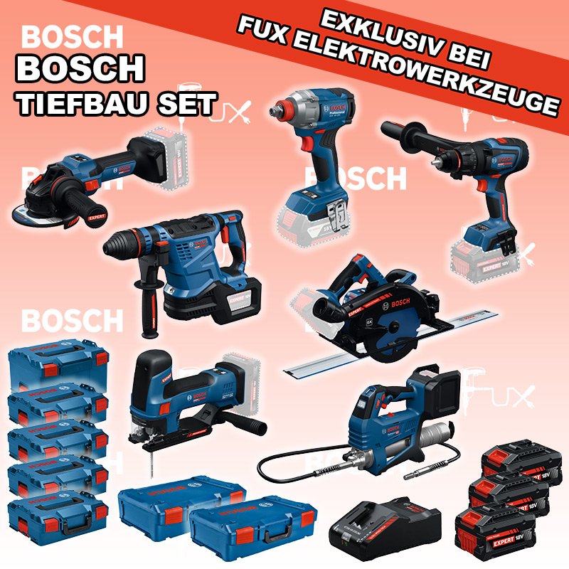 Das Ladenlokal bleibt vom 23. Februar 2026 bis am 28. Februar 2026 geschlossen. Bestellungen und Lieferungen von Neugeräten werden trotz Ferienabwesenheit in gewohnter Fux-Manier entgegengenommen und ausgeliefert. Zu "Bau / Tiefbau Set" von Bosch Professional FUX SPECIAL EXKLUSIV BEI FUX Bosch Expert EXTiefbau Set 3 Bestell- und Artikelnummer: EXTiefbau Set 3 5 Jahre Garantie auf Bosch Expert Maschinen EXSR18V-150 Akku-BohrschrauberAkkuspannung 18 V Drehmoment 84 / 100 / 150 Nm Leerlaufdrehzahl 0 – 550 / 0 – 2200 min⁻¹ Gewicht exkl. Akku 2.1 kgInfos EXBH18V-32F Akku-BohrhammerAkkuspannung 18 V Nenn-Schlagenergie 4.5 J Schlagzahl bei Nenndrehzahl 4300 bpm Nenndrehzahl 0 – 790 min⁻¹ Gewicht exkl. Akku 4.2 kgInfos EXST18V-155S Akku-StichsägeAkkuspannung 18 V Hubzahl bei Leerlauf 800 - 3800 min⁻¹ Hubhöhe 26 mm Gewicht exkl. Akku 1.9 kgInfos EXWS18V-15S Akku-WinkelschleiferAkkuspannung 18 V Leerlaufdrehzahl 11000 min⁻¹ Scheiben-Ø 125 mm Gewicht exkl. Akku 2.2 kgInfos GDX 18V-285 Akku-DrehschlagschrauberAkkuspannung 18 V Anziehdrehmoment 285 Nm Werkzeugaufnahme 1/4" & 1/2" Gewicht exkl. Akku 1.1 kg Infos GFP 18V-10 Akku-KartuschenpresseAkkuspannung 18 V Druck max. 9’999.9 psi Durchflussmenge bis 320 g/minInfos EXKS18V-68GX Akku-KreissägeAkkuspannung 18 V Leerlaufdrehzahl 2500 – 5000 min⁻¹ Schnitttiefe Holz max. 90° 68 mm Schnitttiefe Holz max. 45° 49 mm Sägeblattdurchmesser 190 mm Gewicht exkl. Akku 4.25 kgInfos FSN 1600 Führungsschienensysteme Systemzubehör1600-mm-Führungsschienentechnologie für exaktes SchneidenInfos 3x EXBA18V-80 + EXAL18V-160 Starter-Set3 x EXBA18V-80 Akkupack EXAL18V-160 LadegerätInfos Standard-Ausrüstung In diesem Set enthalten: EXSR18V-150 Akku-Bohrschrauber EXBH18V-32F Akku-Bohrhammer EXST18V-155S Akku-Stichsäge EXWS18V-15S Akku-Winkelschleifer GDX 18V-285 Akku-Drehschlagschrauber GFP 18V-10 Akku-Kartuschenpresse EXKS18V-68GX Akku-Kreissäge FSN 1600 Führungsschienensysteme Systemzubehör 3x EXBA18V-80 + EXAL18V-160 Starter-Set Geliefert im Koffer Zubehör Listenpreis CHF 3'676.30 Fuxpreis CHF 2'843.00 inklusive 8.1% MwSt Kostenloser Versand Kein Grauimport! Produkt bestellen 1 Stück 2 Stück 3 Stück 4 Stück 5 Stück 6 Stück 7 Stück 8 Stück 9 Stück 10 Stück Alle Angaben ohne Gewähr und solange Vorrat reicht! Produkt als PDF NEUHEITAKTION 22%