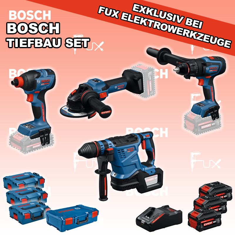 Das Ladenlokal bleibt vom 23. Februar 2026 bis am 28. Februar 2026 geschlossen. Bestellungen und Lieferungen von Neugeräten werden trotz Ferienabwesenheit in gewohnter Fux-Manier entgegengenommen und ausgeliefert. Zu "Bau / Tiefbau Set" von Bosch Professional FUX SPECIAL EXKLUSIV BEI FUX Bosch Expert EXTiefbau Set 6 Bestell- und Artikelnummer: EXTiefbau Set 6 5 Jahre Garantie auf Bosch Expert Maschinen EXSR18V-150 Akku-BohrschrauberAkkuspannung 18 V Drehmoment 84 / 100 / 150 Nm Leerlaufdrehzahl 0 – 550 / 0 – 2200 min⁻¹ Gewicht exkl. Akku 2.1 kgInfos EXBH18V-32F Akku-BohrhammerAkkuspannung 18 V Nenn-Schlagenergie 4.5 J Schlagzahl bei Nenndrehzahl 4300 bpm Nenndrehzahl 0 – 790 min⁻¹ Gewicht exkl. Akku 4.2 kgInfos EXWS18V-15S Akku-WinkelschleiferAkkuspannung 18 V Leerlaufdrehzahl 11000 min⁻¹ Scheiben-Ø 125 mm Gewicht exkl. Akku 2.2 kgInfos EXDX18V-210 Akku-DrehschlagschrauberAkkuspannung 18 V Drehmoment. max. 210 Nm Leerlaufdrehzahl 0 - 1100 / 0 - 1700 / 0 - 2300 min⁻¹ Schlagzahl 0 - 4000 bpm Gewicht exkl. Akku 1.2 kgInfos 3x EXBA18V-80 + EXAL18V-160 Starter-Set3 x EXBA18V-80 Akkupack EXAL18V-160 LadegerätInfos Standard-Ausrüstung In diesem Set enthalten: EXSR18V-150 Akku-Bohrschrauber EXBH18V-32F Akku-Bohrhammer EXWS18V-15S Akku-Winkelschleifer EXDX18V-210 Akku-Drehschlagschrauber 3x EXBA18V-80 + EXAL18V-160 Starter-Set Geliefert im Koffer Zubehör Listenpreis CHF 2'321.00 Fuxpreis CHF 1'802.00 inklusive 8.1% MwSt Kostenloser Versand Kein Grauimport! Produkt bestellen 1 Stück 2 Stück 3 Stück 4 Stück 5 Stück 6 Stück 7 Stück 8 Stück 9 Stück 10 Stück Alle Angaben ohne Gewähr und solange Vorrat reicht! Produkt als PDF NEUHEITAKTION 22%